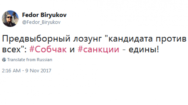 Член Бюро Президиума "РОДИНЫ", руководитель Инофрмационно-политического управления партии, публицист Федор Бирюков иронично предложил предвыборному штабу Собчак лозунг: "Собчак и санкции - едины".