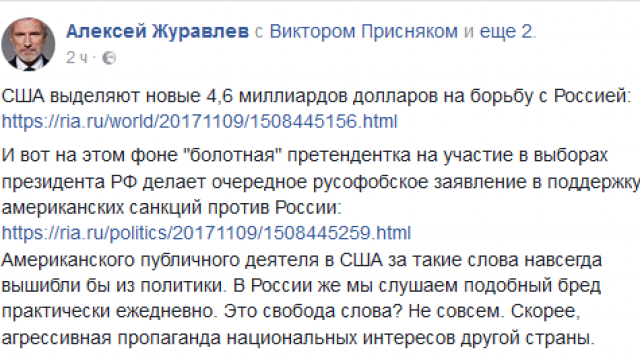 Председатель партии "РОДИНА", депутат Госдумы Алексей Журавлев отметил, что Собчак сделала "очередное русофобское заявление".