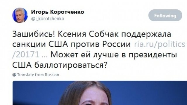 А известный военный эксперт, член Президиума и председатель Совета партии "РОДИНА" по вопросам национальной безопасности Игорь Коротченко посоветовал Ксении Собчак "лучше баллотироваться в президенты США".