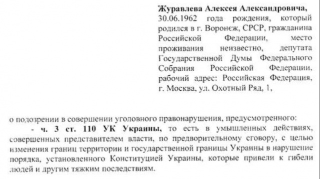 "Вот такой официальный документ пришел на адрес Госдумы РФ от СБУ - меня подозревают в нарушение территориальной целостности Украины. Интересно, что нарушил я ее еще 22 февраля, за пару дней до начала российской спецоперации", - пишет политик.