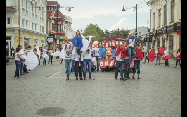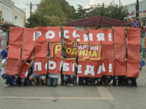Около сотни молодых людей, танцуя под гимн России, развернули в центре крымской столицы российский флаг. Затем конструкция трансформировалась в полотно с изображением логотипа партии "РОДИНА".